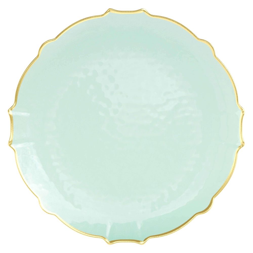 These 10-inch Mint/Gold Petal plates come in a set of 20, perfect for any special occasion. With their elegant design and sturdy construction, they add a touch of sophistication to your table setting. Made with high-quality material, these plates are durable and easy to clean.