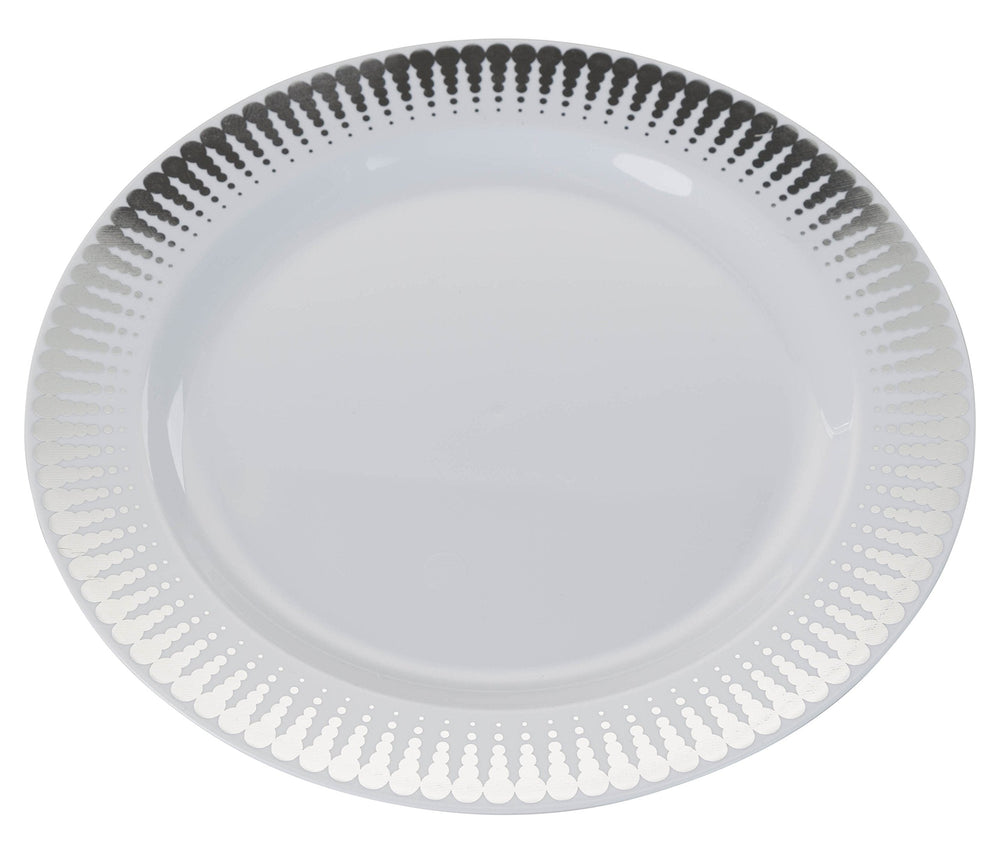 Each Pack Contains 10 Plastic Plates. Our Radial Design Plates Are Crafted To Offer Both Sophistication And Convenience, Allowing You To Create An Effortlessly Chic Table Arrangement Without The Fuss. The Classic Metallic Rim Serves As A Stylish Complement To Your Culinary Presentations, Blending Seamlessly With Any Table Decor To Enhance The Overall Dining Ambiance. Ideal For Those Who Prioritize Both Flair And Functionality, These Plates Are The Perfect Choice For Showcasing Your Impeccable Taste.