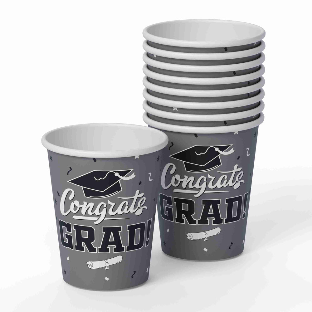 Celebrate your graduate in style with our 9 Oz. White/Silver Graduation Cups! These durable cups hold 9 ounces of your favorite beverage and come in a convenient pack of 24. Cheers to your graduate's accomplishments with these sleek, modern cups.