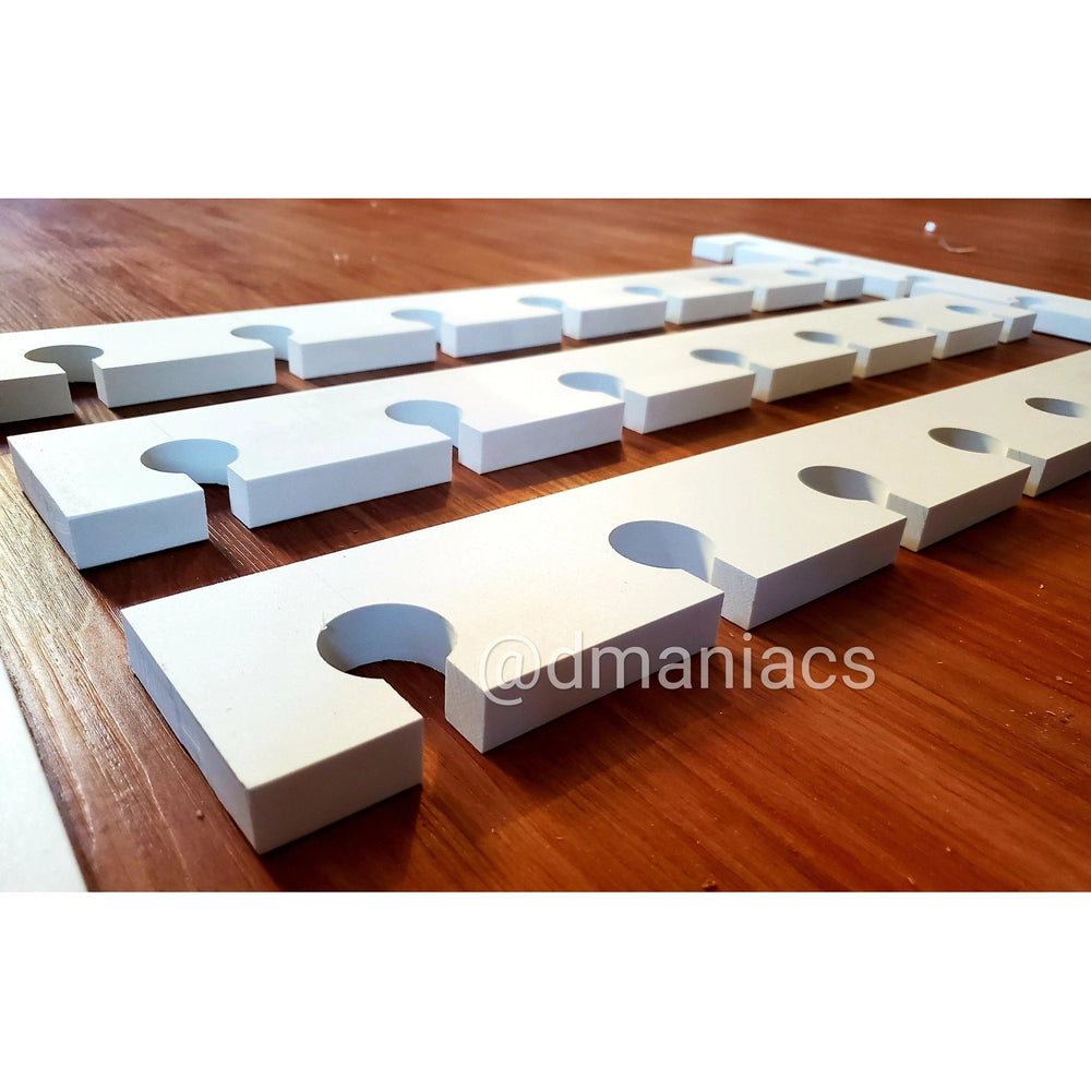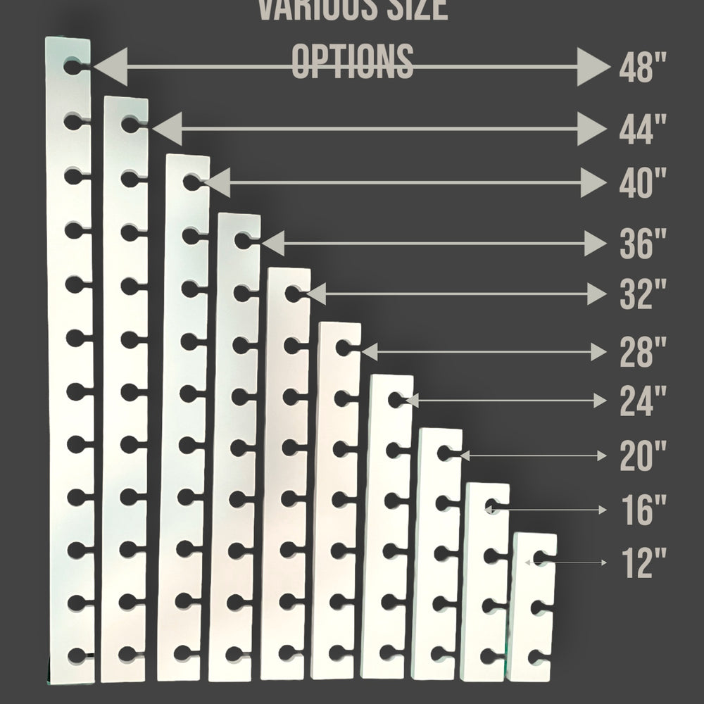 Alle Regale sind 3,25 Zoll breit und 3/4 Zoll tief. Die Länge variiert jedoch und bestimmt auch, wie viele Gläser das Regal aufnehmen kann, wie unten zusammengefasst:
