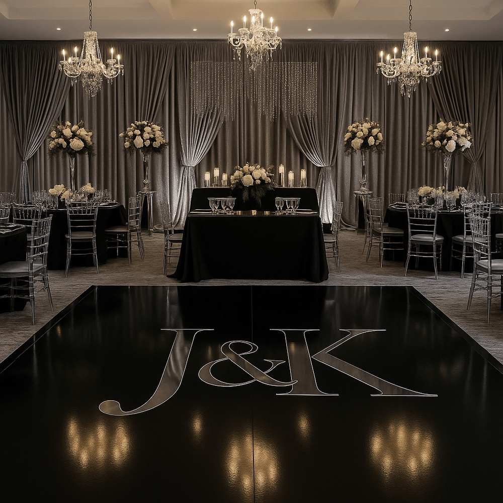 If your venue already has a floor, let’s wrap it! Our vinyl dance floor wrap for weddings covers up tired wood, carpet, or tile with a sleek, photogenic finish.