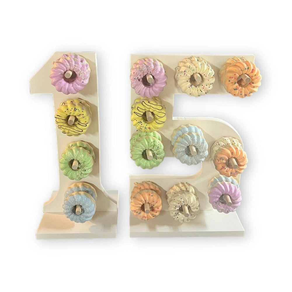 - Der Donut-Wandständer hat die genaue Form der Zahl 15 und ist somit ein perfekter Blickfang für 15. Geburtstagsfeiern oder Jubiläumsfeiern.
