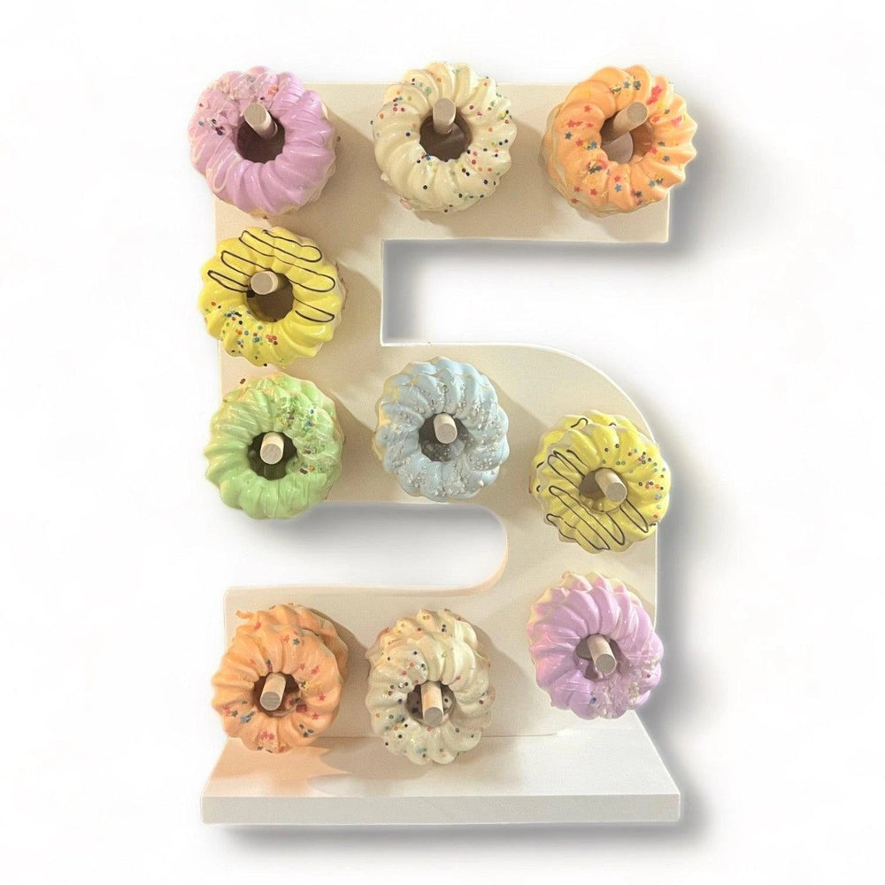 - Größe: Die Nummer 1 ist 8 Zoll breit und 18 Zoll hoch, während die Nummer 5 12 Zoll breit und 18 Zoll hoch ist und reichlich Platz bietet, um bis zu 28 Donuts in Standardgröße (jeweils 3 bis 3,3 Zoll) zu präsentieren.