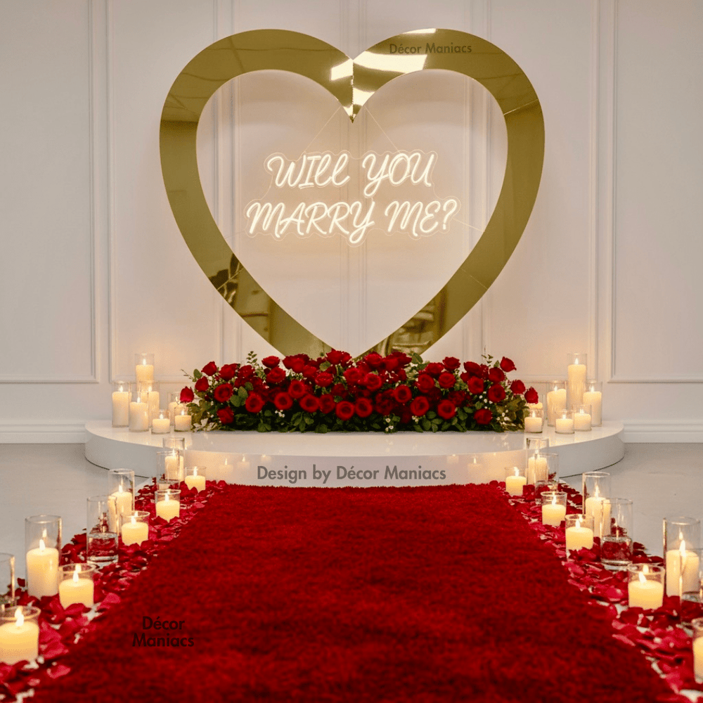 This intimate proposal setup brings romance, warmth, and cinematic elegance to your special moment — complete with candlelit ambiance, lush red florals, and our signature mirrored gold heart backdrop that frames the “Will You Marry Me?” LED sign.