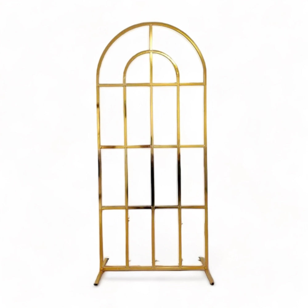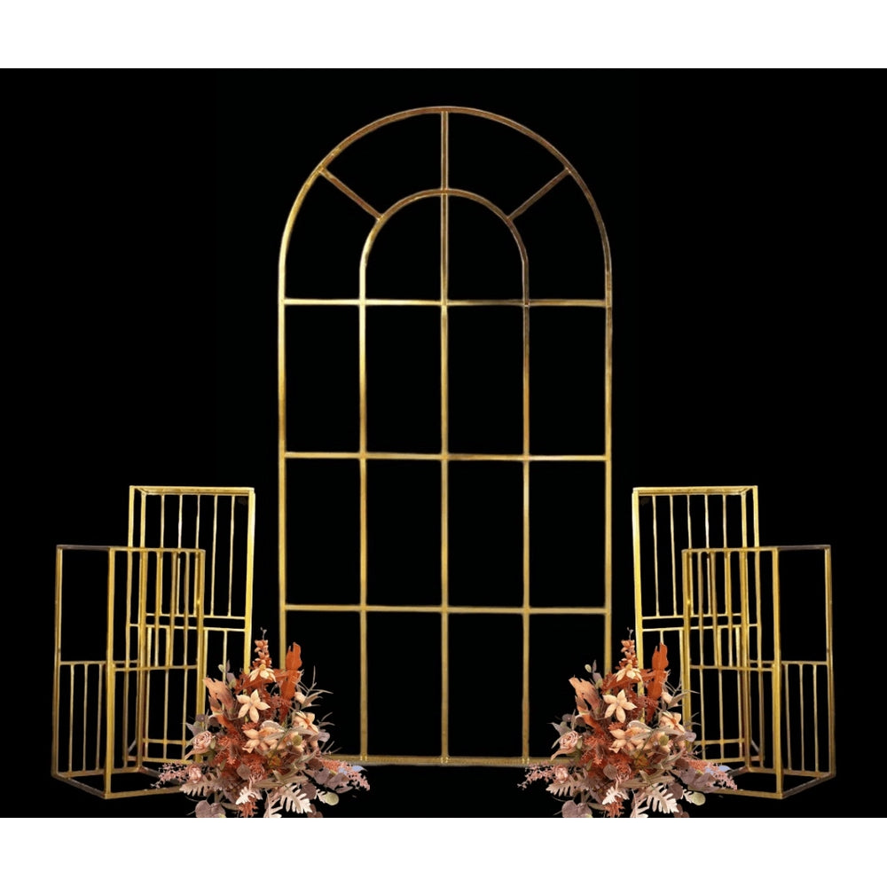 Soporte de fondo con arco para boda con ventana dorada brillante