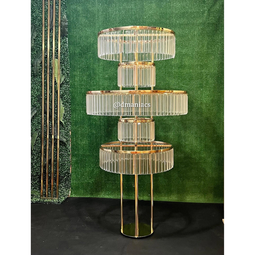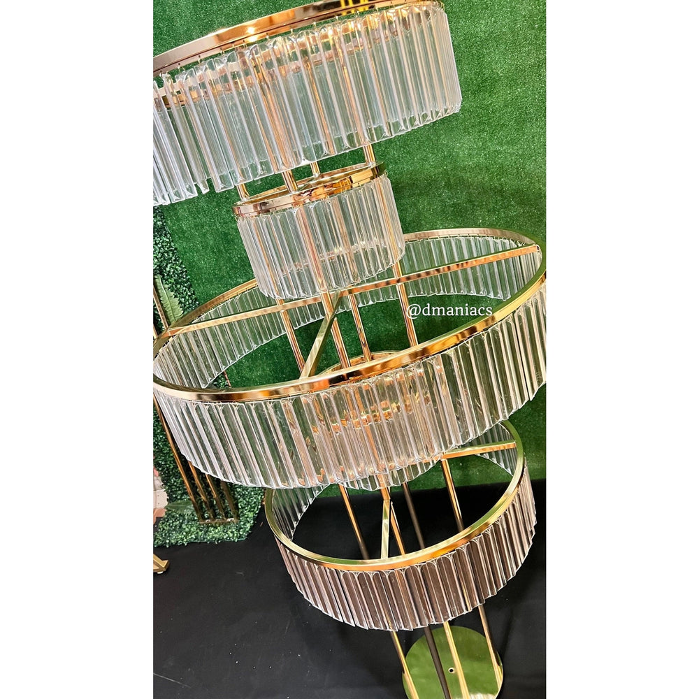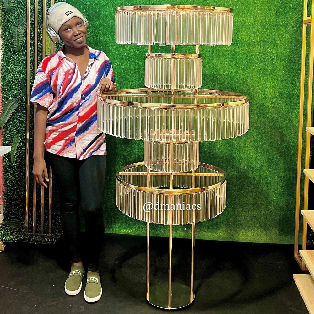 Este opulento centro de mesa de acrílico para bodas de 1,5 m de alto, con su marco dorado y cristales transparentes, es un testimonio de sofisticación y transforma la decoración de la mesa de tu boda en una exhibición elegante y llamativa. La imponente estructura y los detalles brillantes captan la luz y crean un ambiente cautivador para tu día especial.