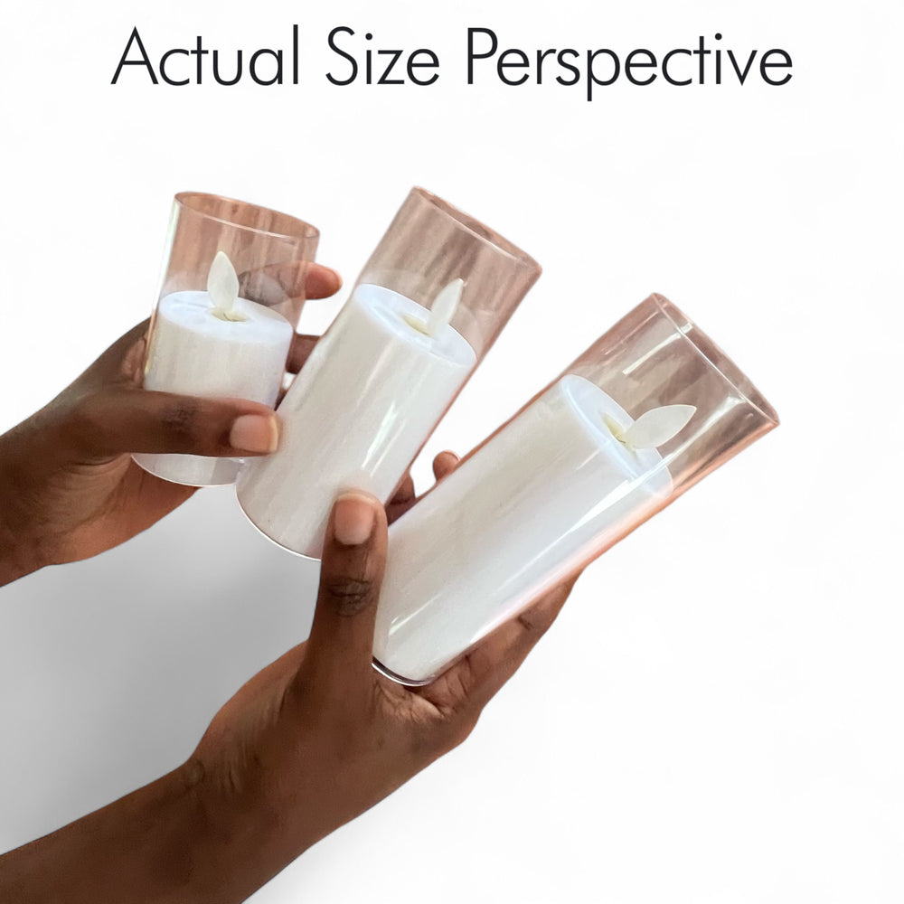 - Includes three flameless pillar candles in varied heights: 3.9”, 4.9”, and 5.9”. All 2.17” in diameter.