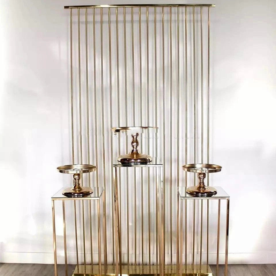 Realce el ambiente de su evento con el "Fondo de pantalla de lujo para decoración de fiestas de bodas". Esta exquisita pieza, alta y con un acabado dorado clásico, sirve como el lienzo perfecto para sus decoraciones creativas, lo que garantiza que su lugar resuene con elegancia y sofisticación.