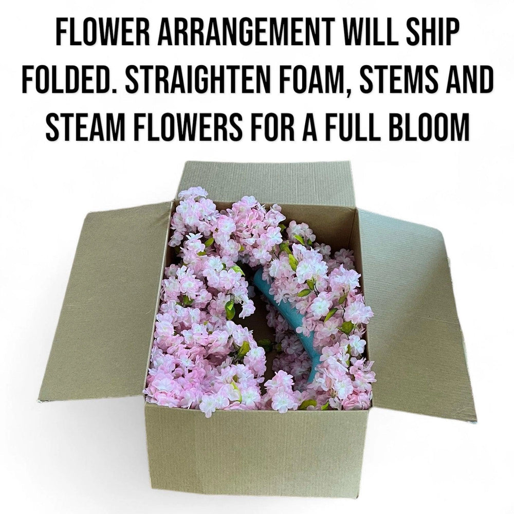- Adornado con un arreglo floral de flores de cerezo rosadas o blancas, cada flor está meticulosamente pegada a mano en espuma floral para garantizar una exhibición segura y duradera.
