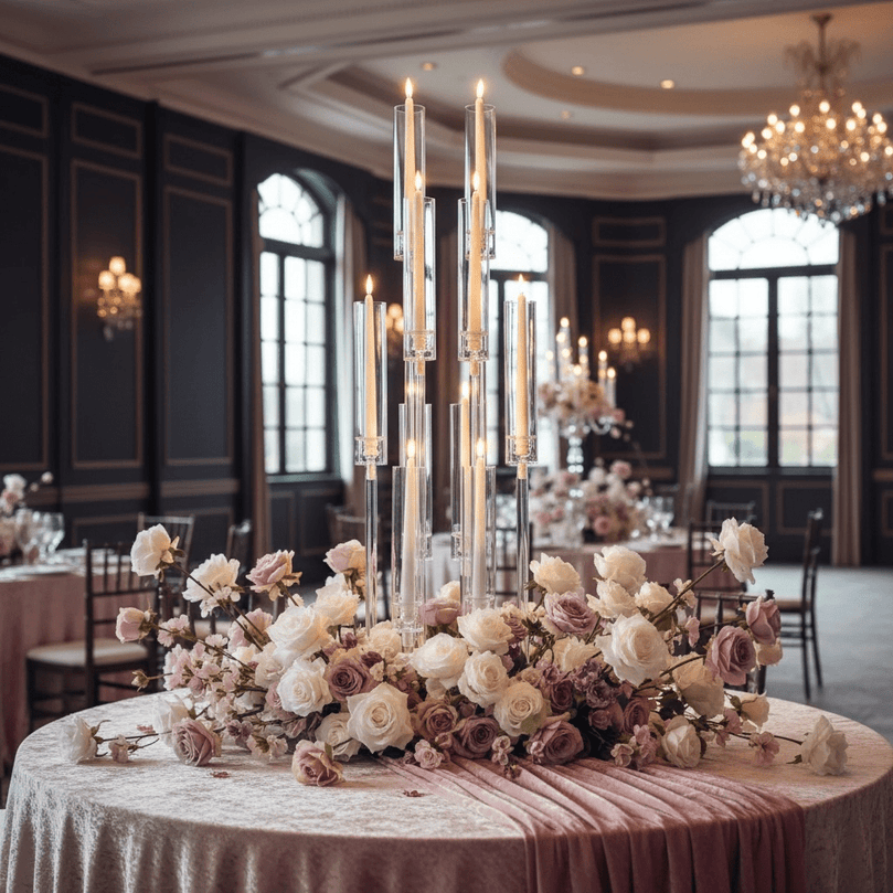 Make a grand statement at your next event with this towering 10-Arm Wedding Table Centerpiece. Designed to mimic the clarity and elegance of crystal, this 37-inch candelabra creates a soaring, cinematic visual effect without the fragility of glass.