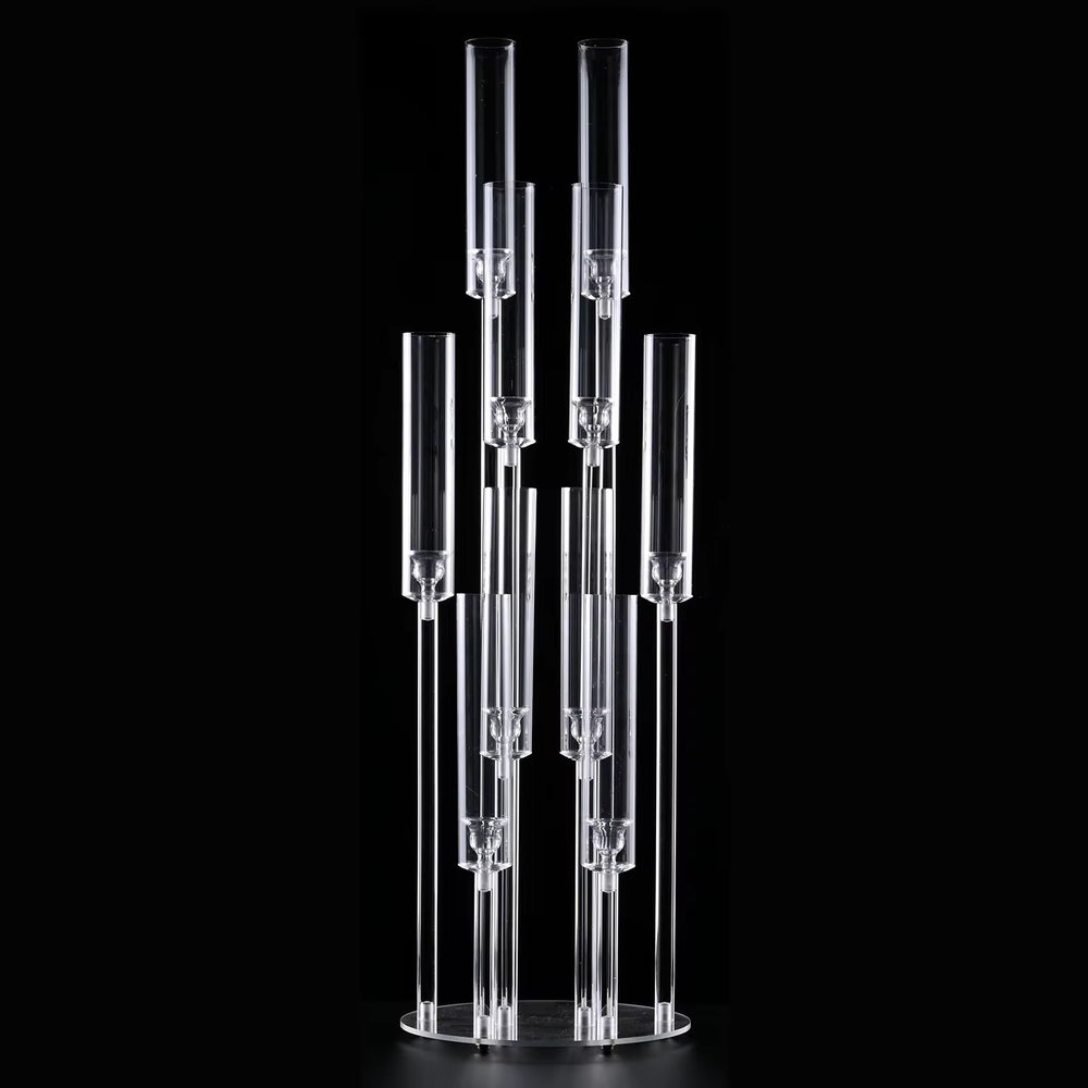 The tiered design features ten individual arms at varying heights, creating a cascading "waterfall" of light that draws the eye upward. Whether you are styling a romantic wedding reception, a gala, or a formal dinner, this clear acrylic candelabra blends seamlessly with any color palette, allowing your floral arrangements and table decor to shine.