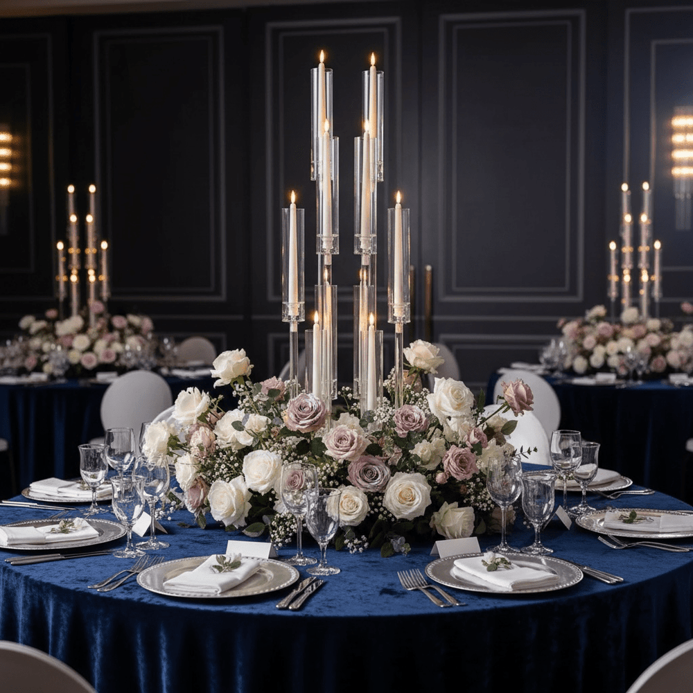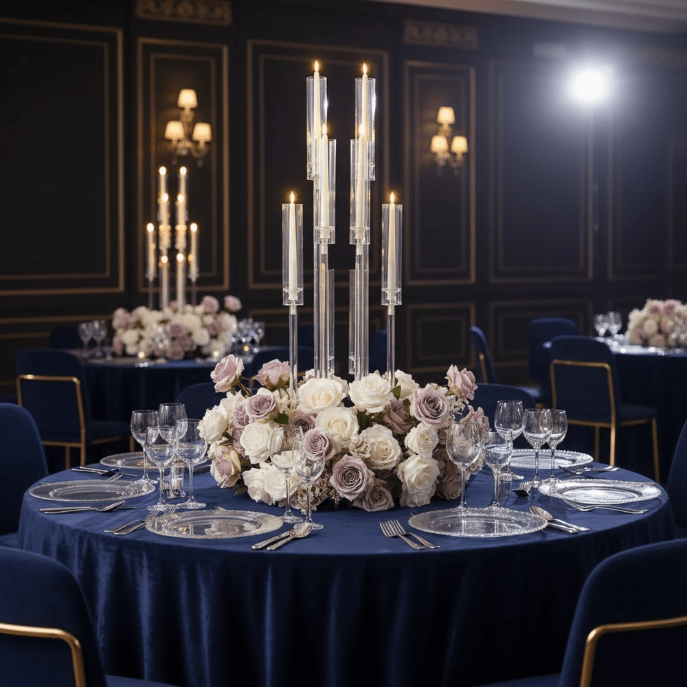 Make a grand statement at your next event with this towering 10-Arm Wedding Table Centerpiece. Designed to mimic the clarity and elegance of crystal, this 37-inch candelabra creates a soaring, cinematic visual effect without the fragility of glass.