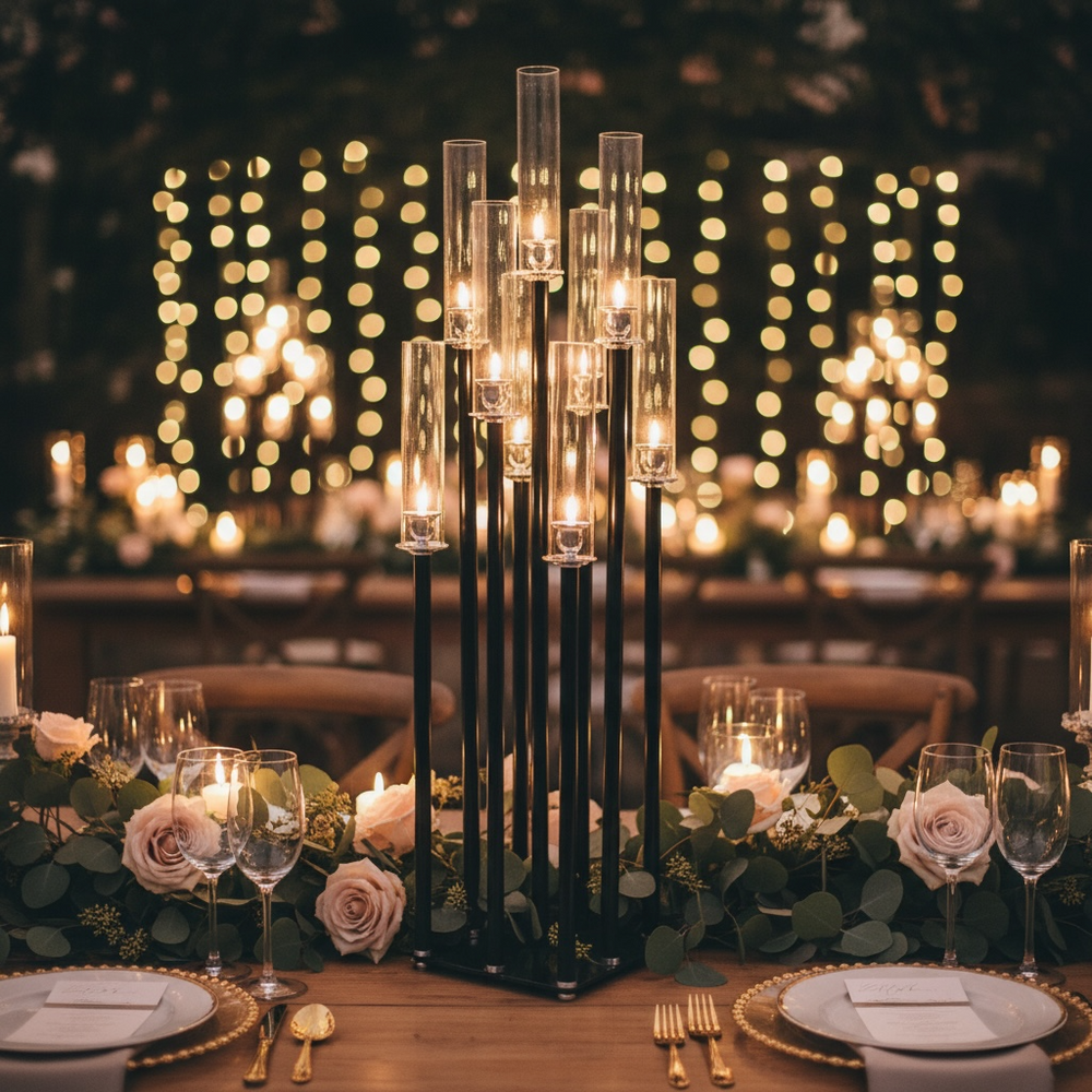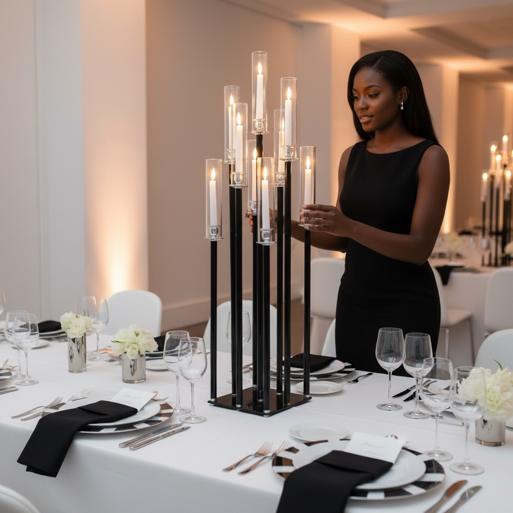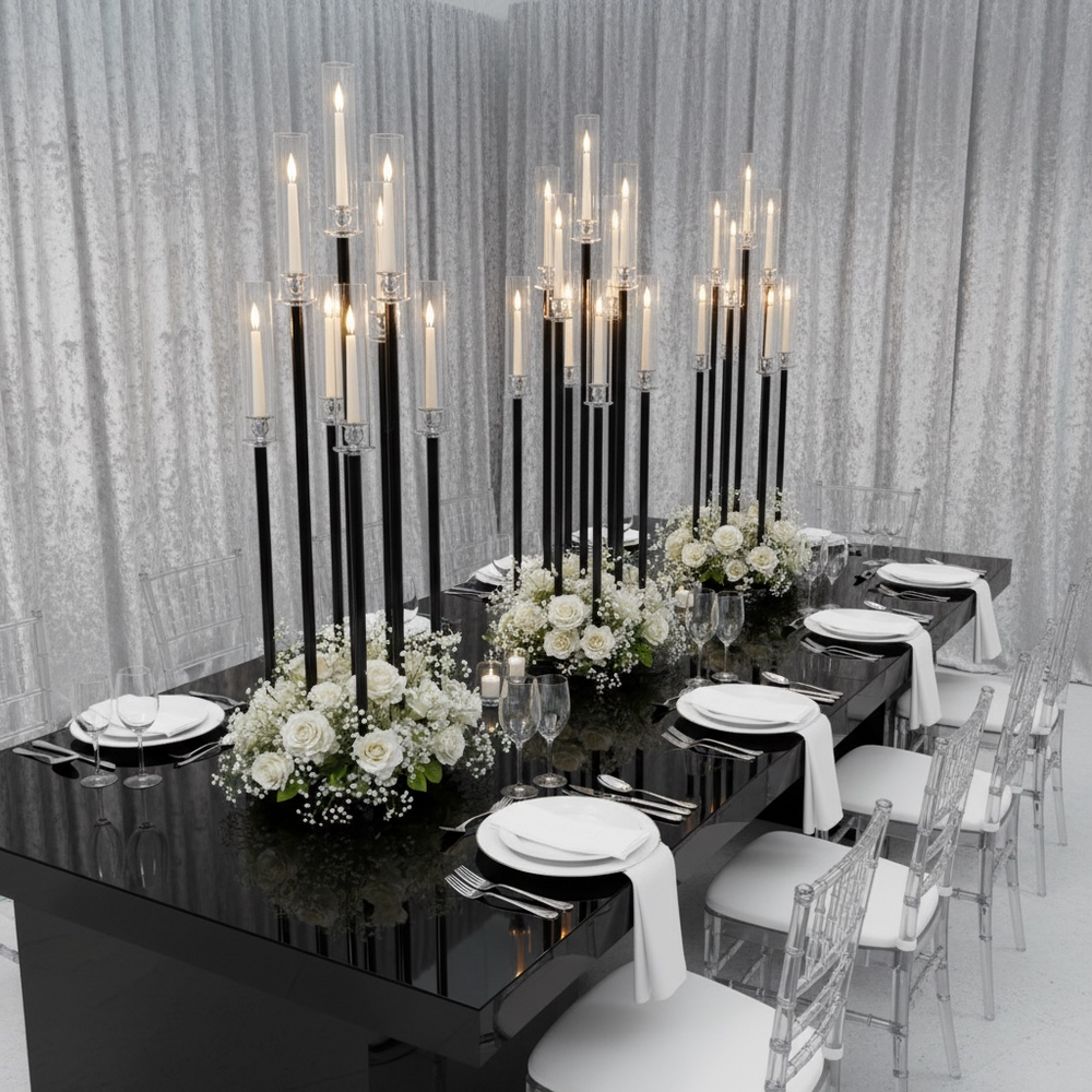 The glossy jet-black finish offers a sleek, contemporary alternative to classic crystal or metal. Its multi-tiered design creates a moody, cinematic atmosphere, allowing candlelight to float at varying heights above your guest's conversations.