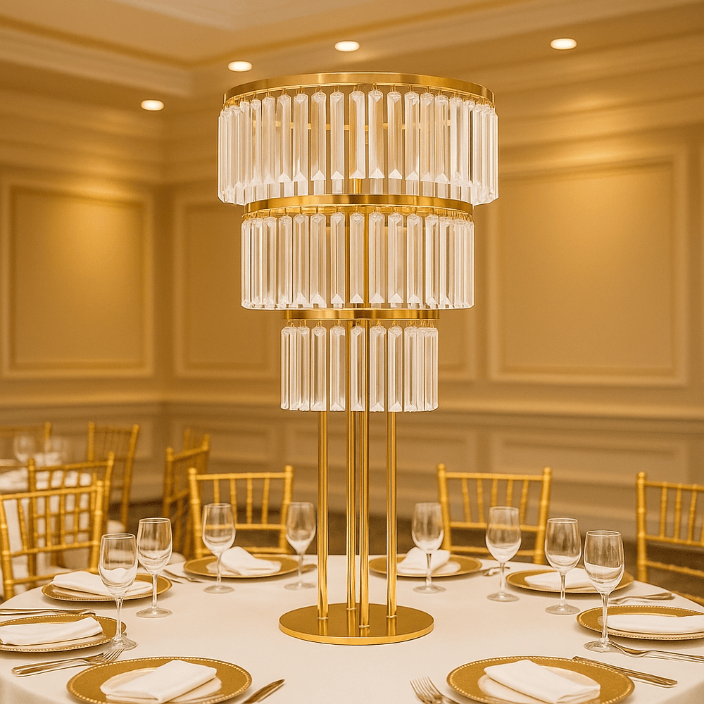 Ready to bring red carpet vibes to your reception? Our luxe wedding centerpieces for rent are what chandelier dreams are made of. Towering at over 35 inches tall with dangling crystal pendants and a gold metal frame, these centerpieces command attention—without saying a word. Whether you’re going for royal elegance or modern glam, this is your table’s new bestie.